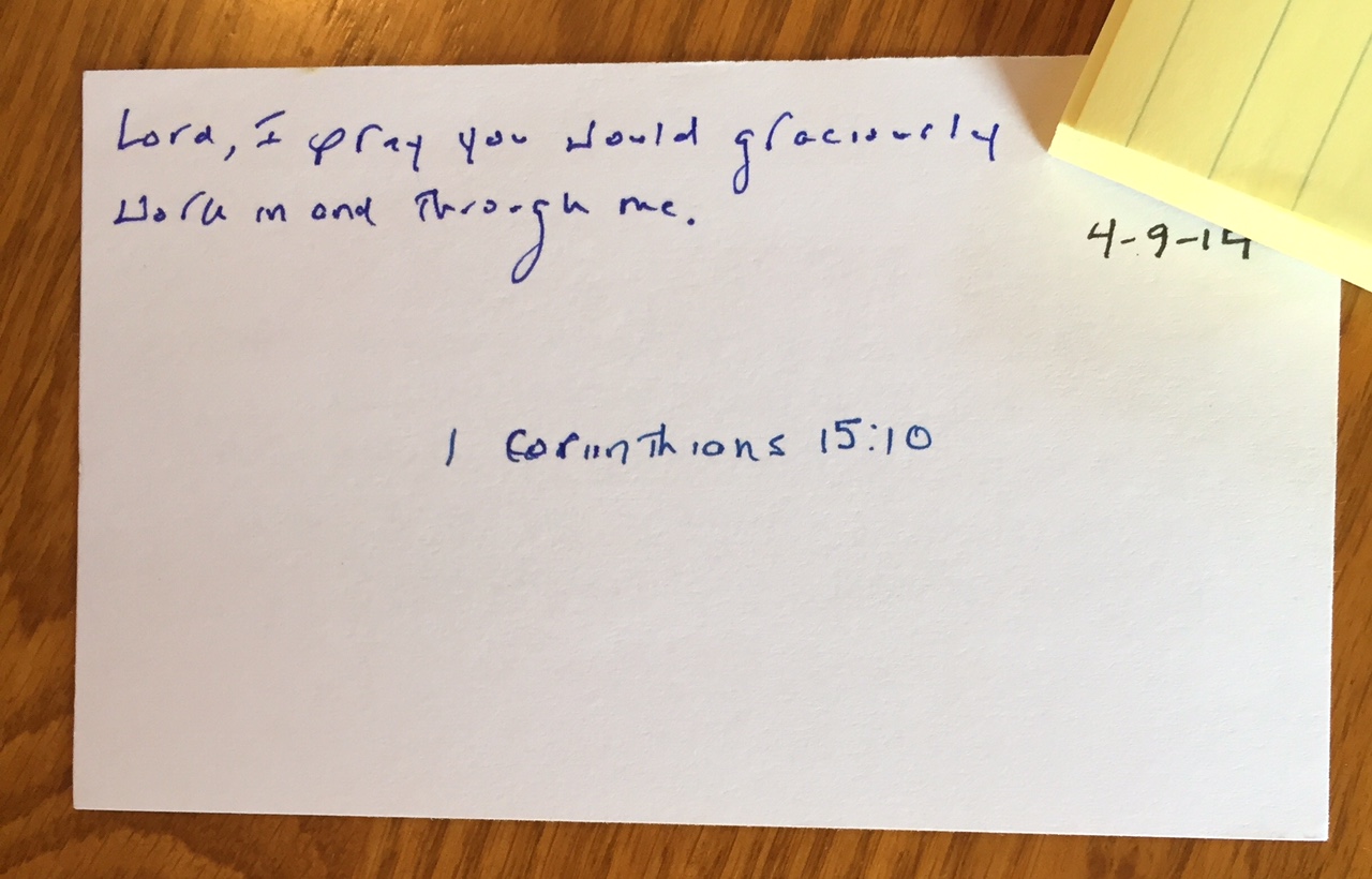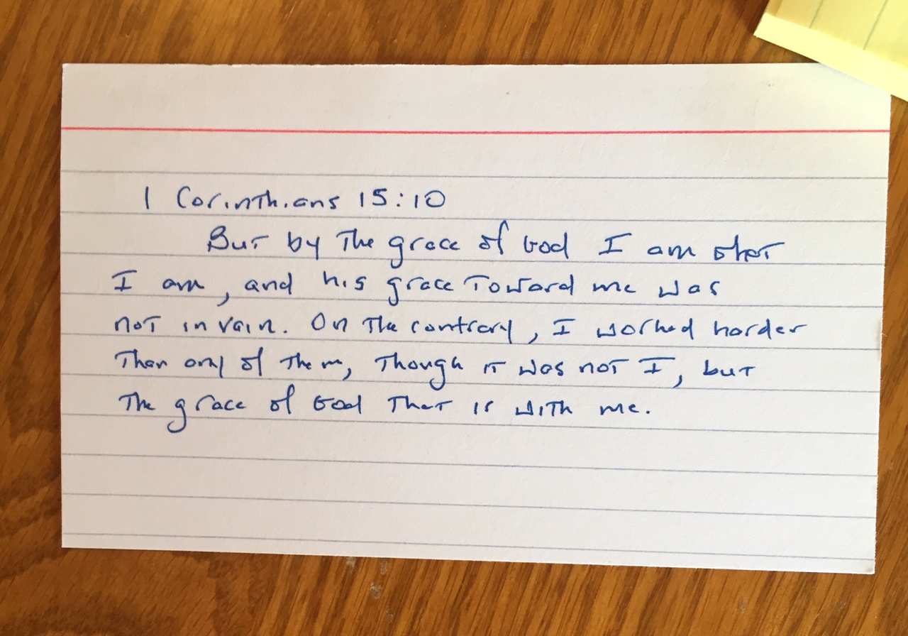 After I have completed the sequence of saying the verse 25-20-15-10-5 times across consecutive days, I write the verse on a 3×5 card and review it daily. Ideally, I review a particular verse: